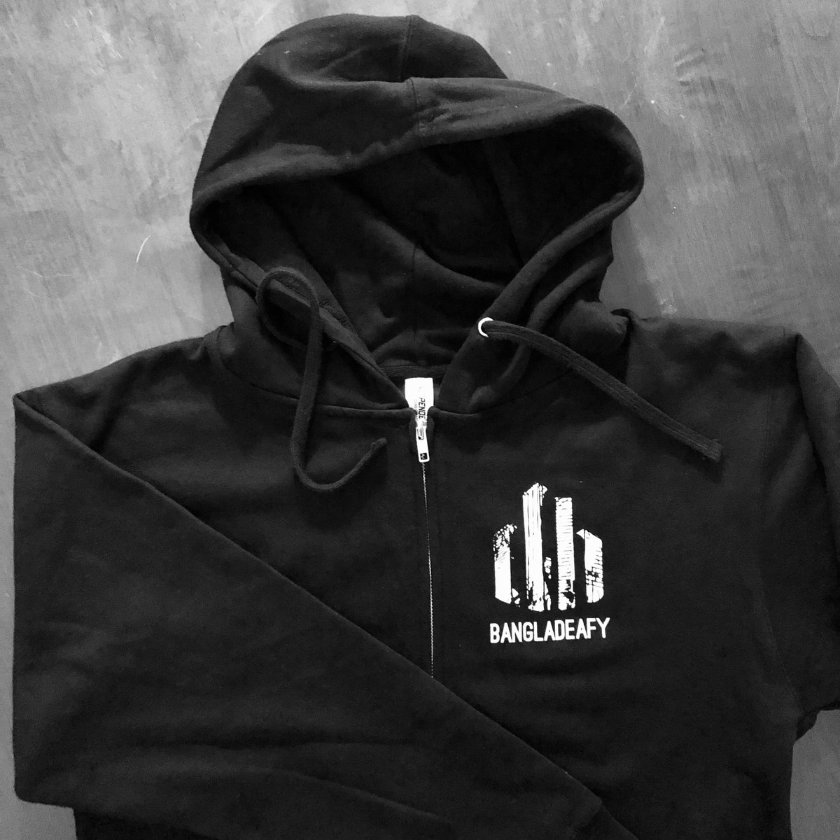 Black Independent Trading Co zip hooded sweatshirt, screen printed at Fishgrease Industries using discharge inks for that super soft feel.